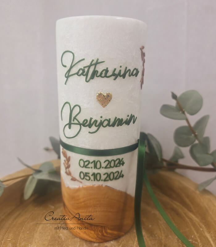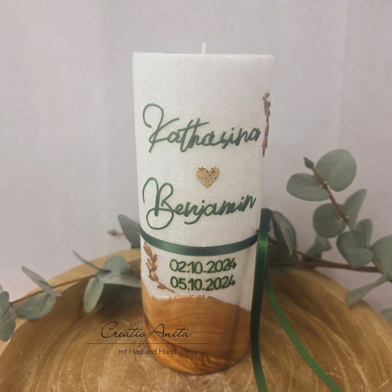 Hochzeitskerze mit echtem Holz und Teelichteinsatz, Ranken Dunkelgrün Gold