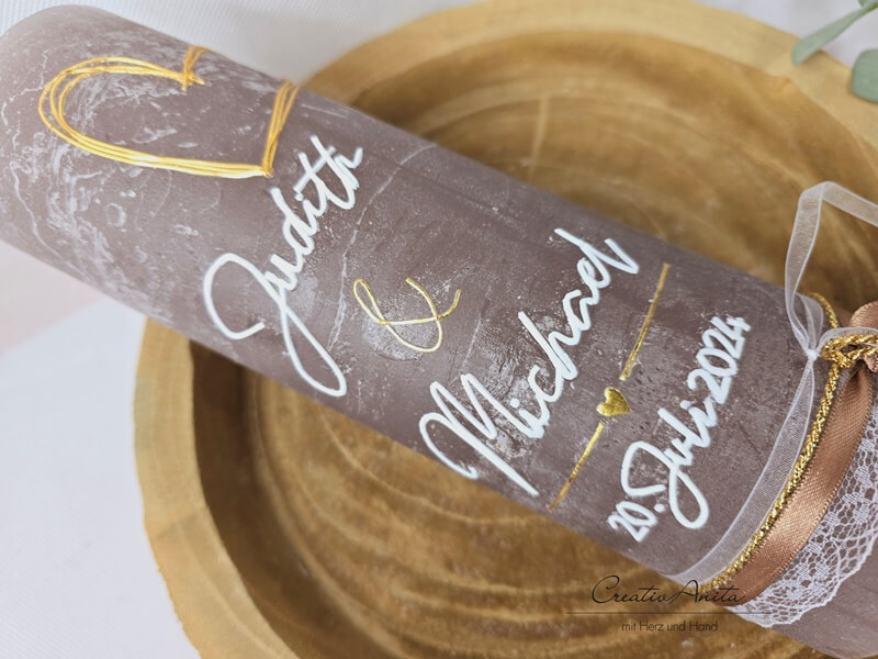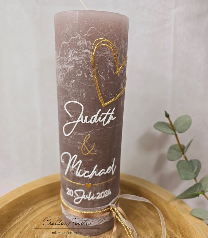 Hochzeitskerze -Modern heart- in taupe-gold mit Spitzenband, Jute und Perlen