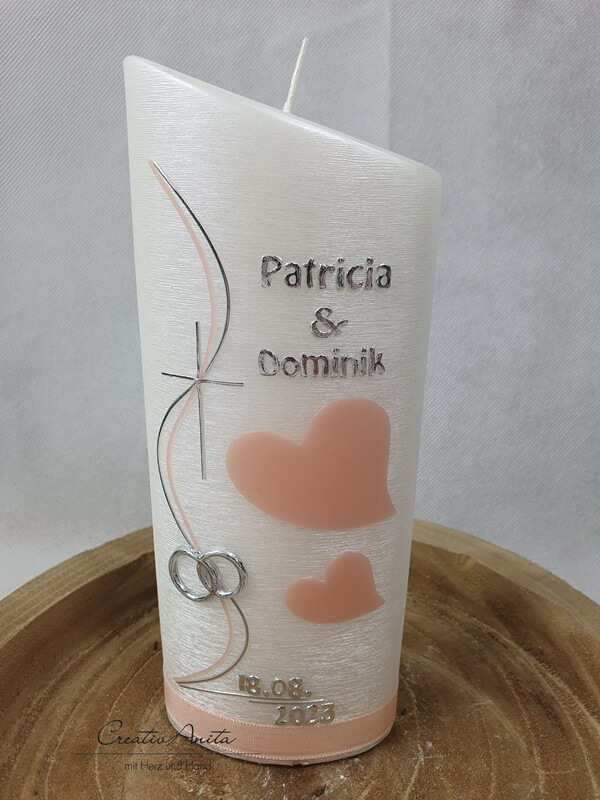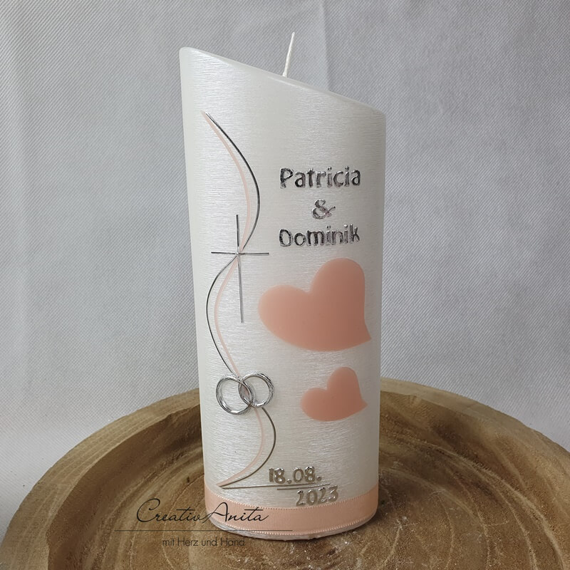 Hochzeitskerze Perlmutt geriffelt - Ellipse abgeschrägt mit Herzen - APRICOT-SILBER