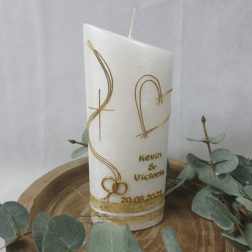 Hochzeitskerze Perlmutt geriffelt - Ellipse abgeschrägt mit Herzen - Gold oder Silber