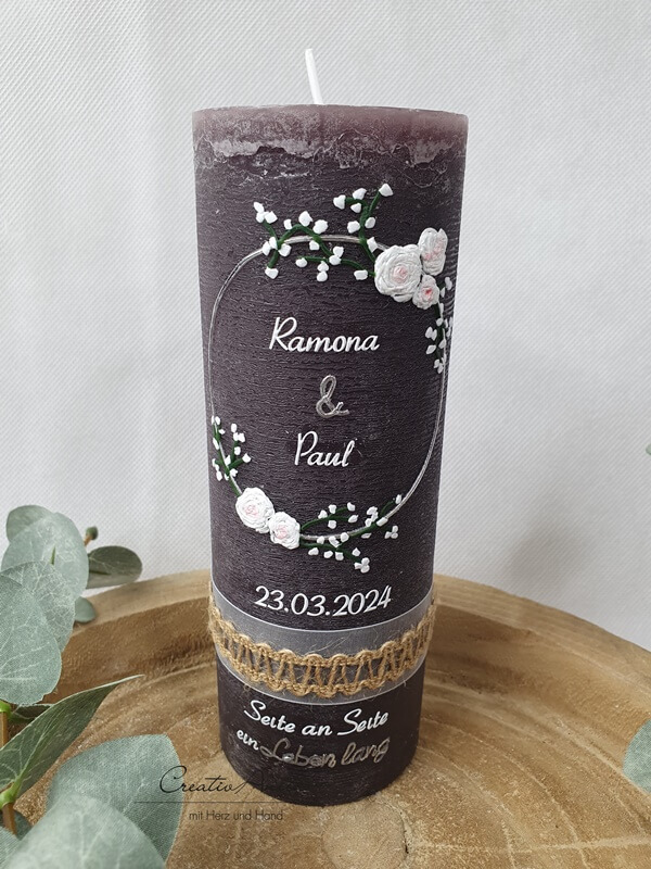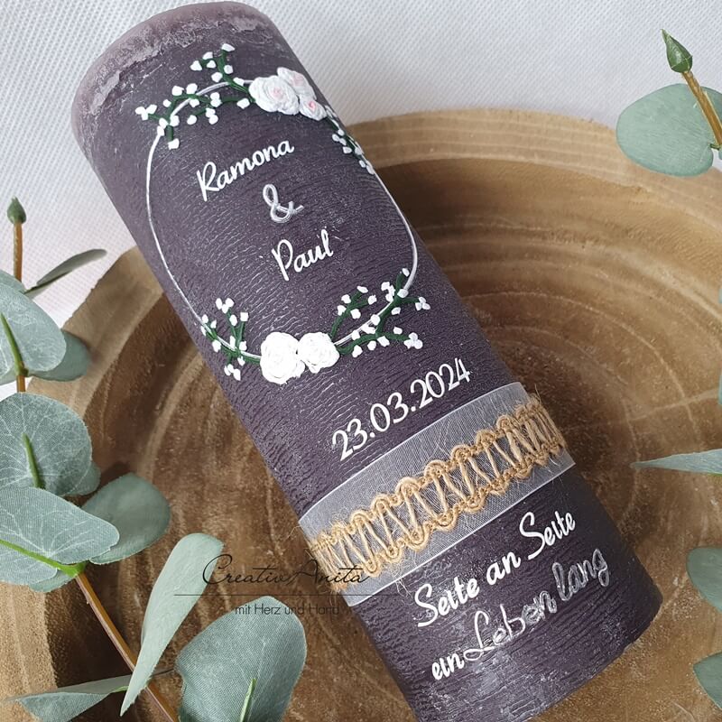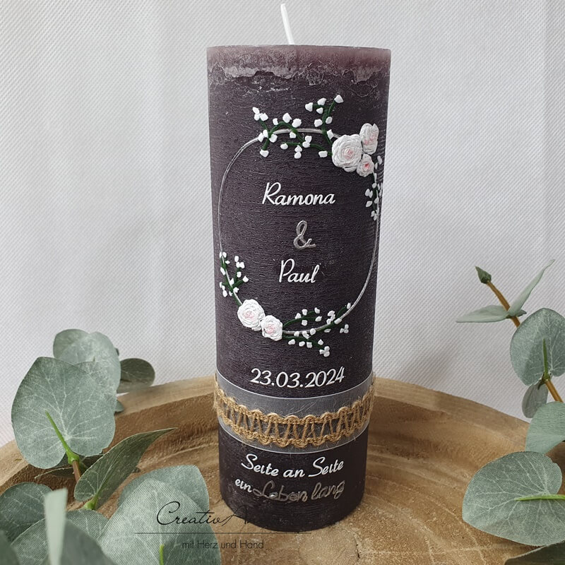 Hochzeitskerze Rustik anthrazit - Edler zarter Blütenkreis weiß-silber