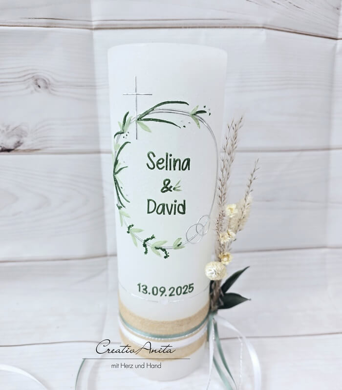 Hochzeitskerze Rustik weiß - Blätterkreis - silber-grün metallic FILIGRAN - wahlweise mit/ohne Teelichteinsatz
