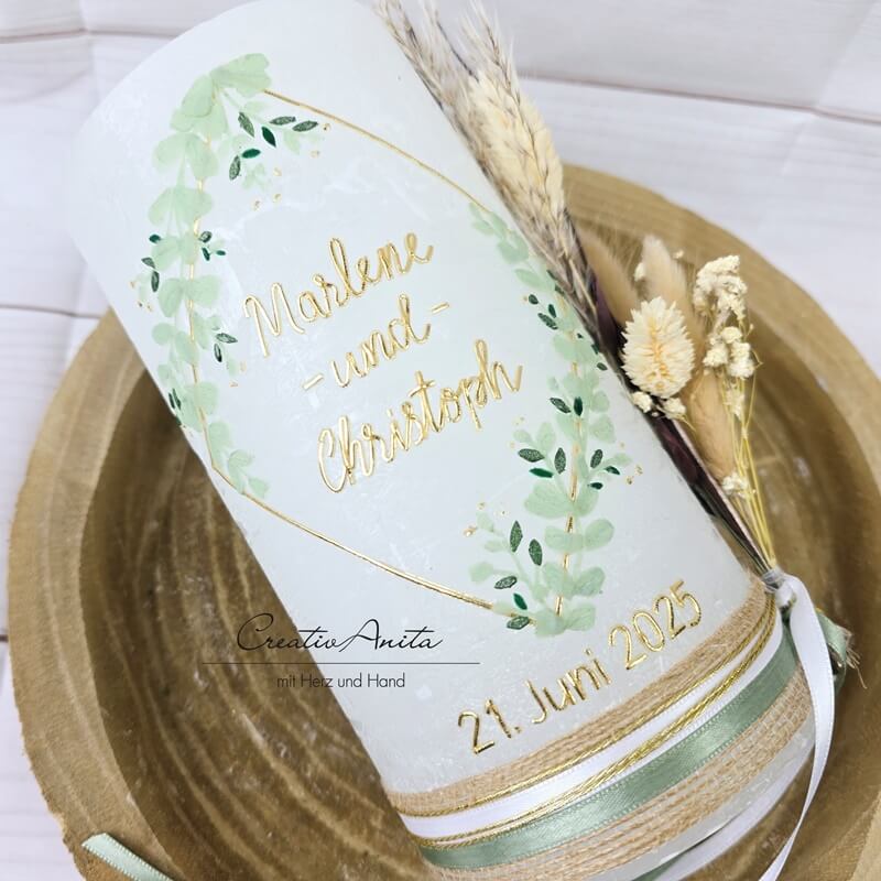 Hochzeitskerze Rustik weiß groß - Geometric Style Eukalyphtusstyle