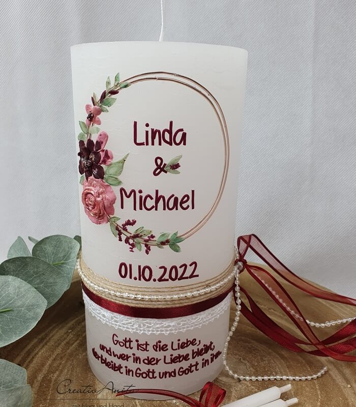 Die Rustikkerze ist weiß. Kerzendesign in den Farben roségold, bordeaux und altrosa.