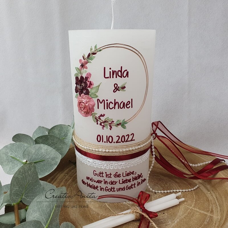 Wunderschön gestaltete Hochzeitskerze im trendigen Stil - Blütenkreis!