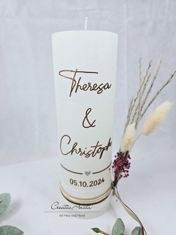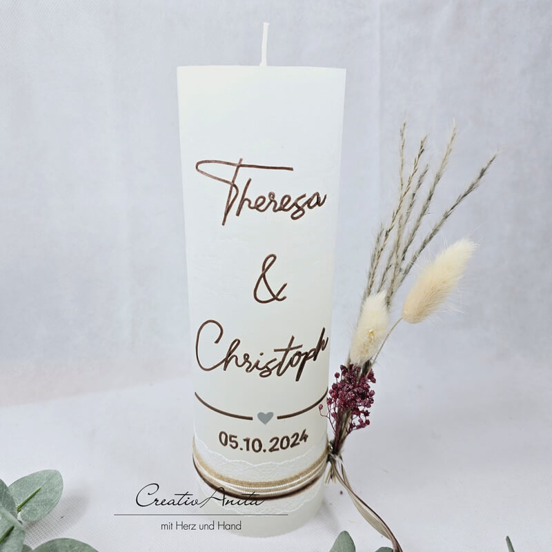 Hochzeitskerze Rustik weiß groß mit/ohne Teelichteinsatz - Schrift Braun metallic, Trockenblumen