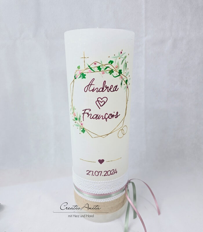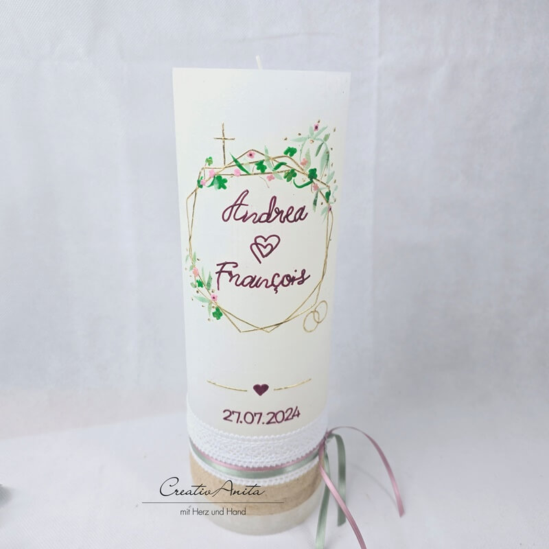Hochzeitskerze Rustik weiß XXL mit Teelichteinsatz - Geometric Blätterkranz - Salbei-Gold-Grün-Altrosa-Bordeaux