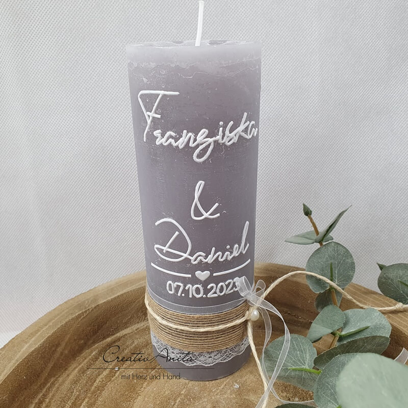 Hochzeitskerze Rustikkerze in grau mit Spitzenband, Jute und Perlen - Personalisiert