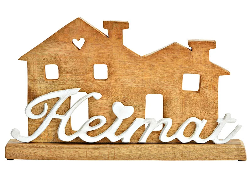 Im Vordergrund zeigt dieser Deko Aufsteller den silbernen Schriftzug "Heimat". In einer eleganten Schrift und mit einem Herz als i-Punkt hebt sie sich nicht nur durch die Farbe, sondern auch im Design von den geraden Linien des Holzhauses ab. Es entsteht ein kontrastreicher und doch harmonischer 3D Schriftzug Holz und Metall, welcher mit einer Größe von 40cm wunderbar als Wohnzimmerdekoration oder auch Flurdeko verwendet werden kann.