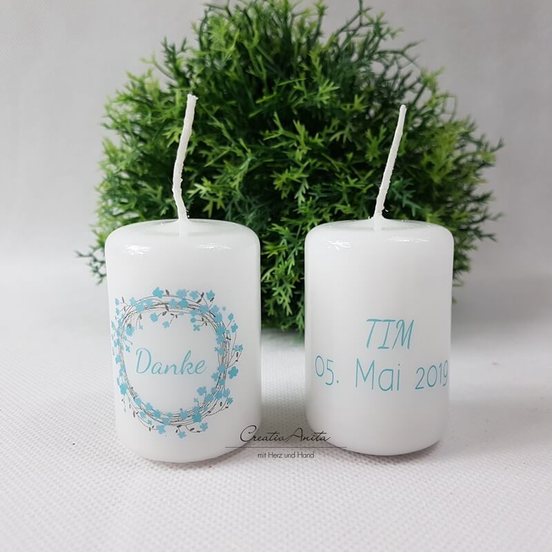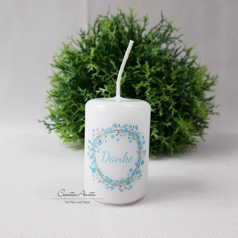 Liebevoll gestaltete Kerze mit Blumenmuster und "Danke" in Blau.