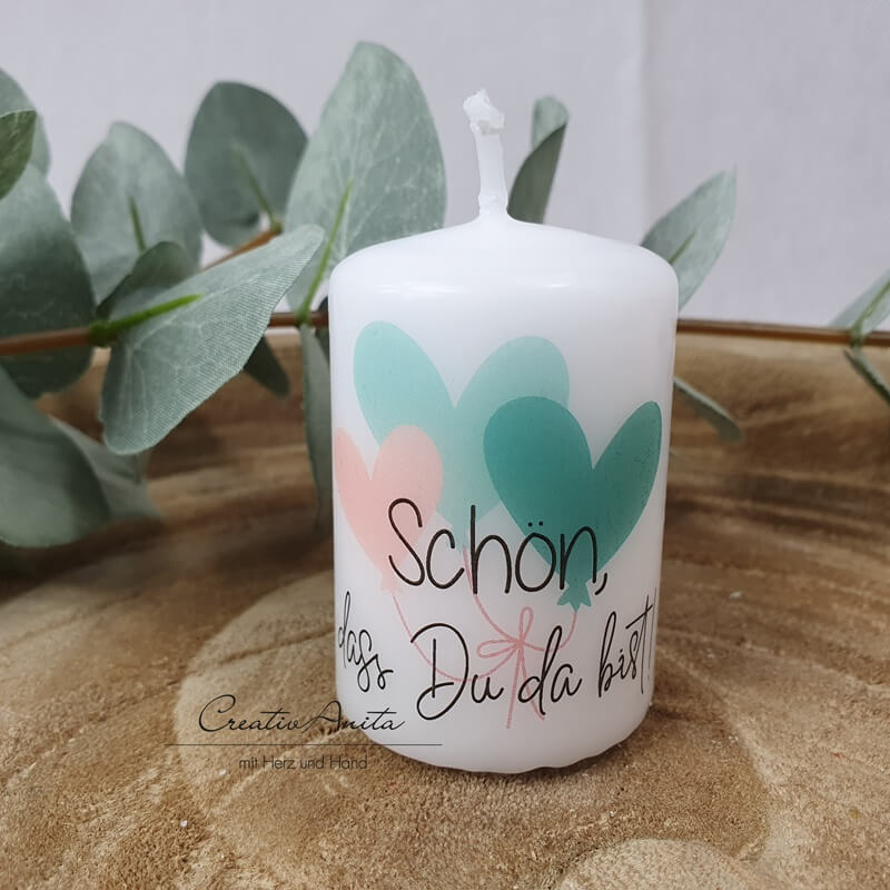 Liebevoll gestaltete Kerze mit Aufdruck "Schön, dass Du da bist" und Herz-Luftballons in den Farben apricot-rosa, petrol und mint.