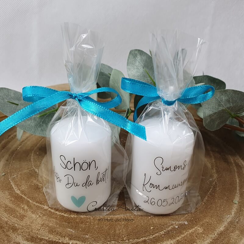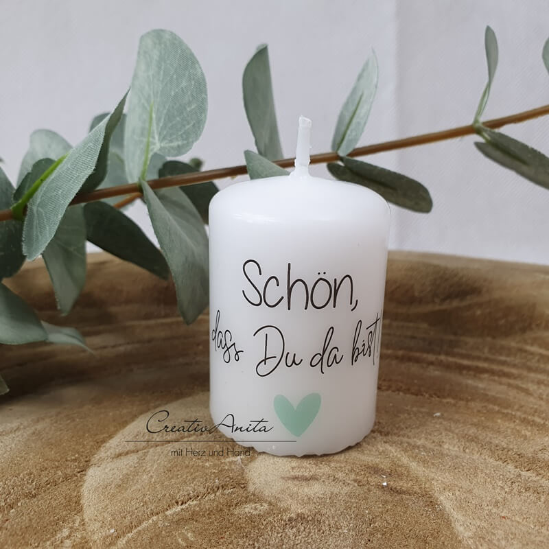 Liebevoll gestaltete Kerze mit Aufdruck "Schön, dass Du da bist" und einem kleinen Herz in Mintfarben.