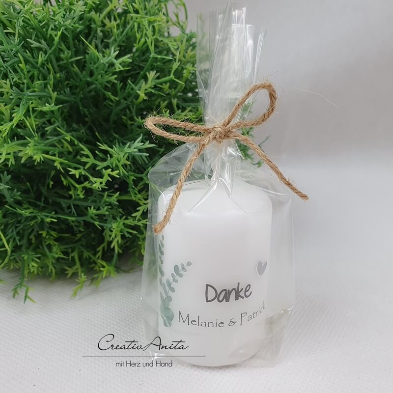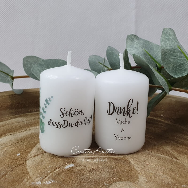 Kerze -Schön, dass Du da bist- als Gastgeschenk mit Eukalypthus