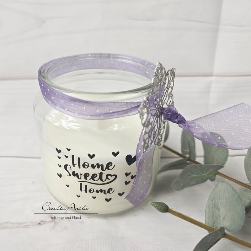 Kerze im Glas mit Spruch -Home sweet Home-. Das Kerzenwachs ist weiß.