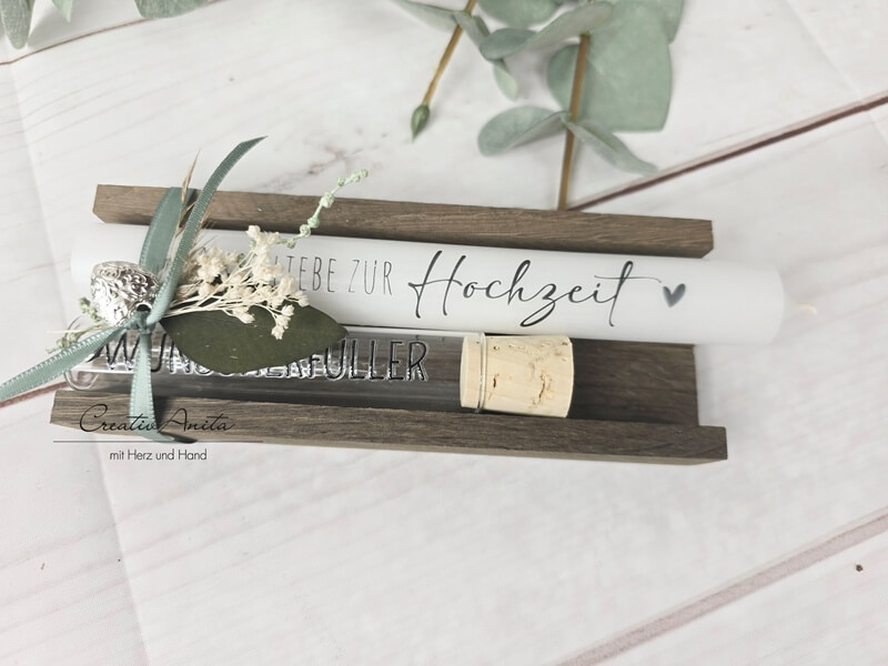 1 Stück Stabkerze mit dem Glückwunsch -Alles liebe zur Hochzeit-, dekoriert mit Trockenblumen in toller dunkler edler Holzverpackung. In die Blumen wurde auch noch ein silberfarbenes Herz gebunden. Desweiteren füllt die Box ein Reagenzglas mit der Aufschrift -Wunscherfüller-, dieses Glas kann mit Geld, Gutschein oder Sprüche befüllt werden.