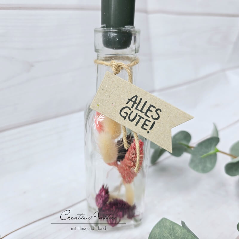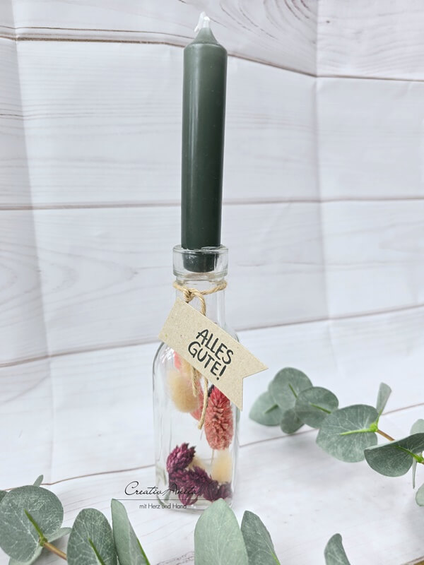 Kerzenständer - Glasflasche befüllt mit Trockenblumen - Alles Gute