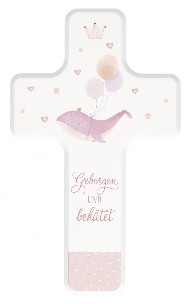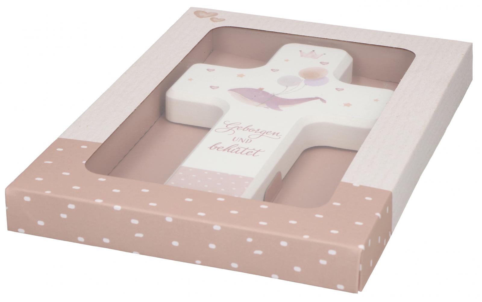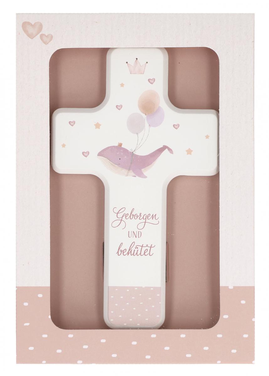 Kinderholzkreuz zur Taufe rosa - Geborgen und behütet
