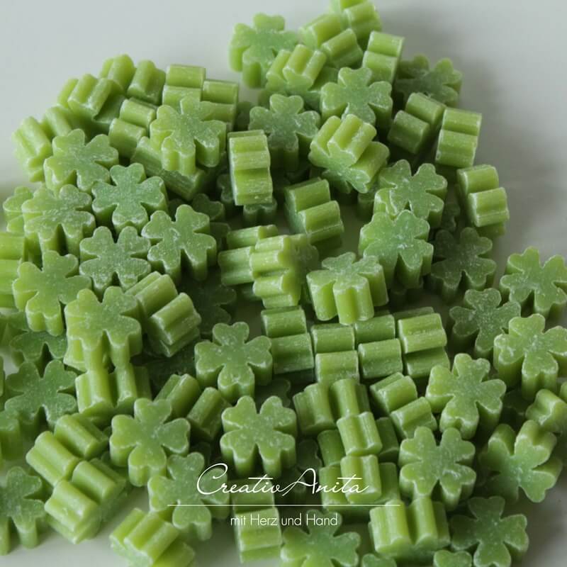 50 Kleeblätter in der Duftnote Birne. Die Seifen-Kleeblätter sind ideal als kleine Mitbringsel, Glücksbringer, als Tischdeko, zum Befüllen von GiveAways/Gastgeschenken oder als Füllmaterial von Duftsäckchen, oder einfach für den Kleider- oder Wäscheschrank. Der Fantasie sind keine Grenzen gesetzt.