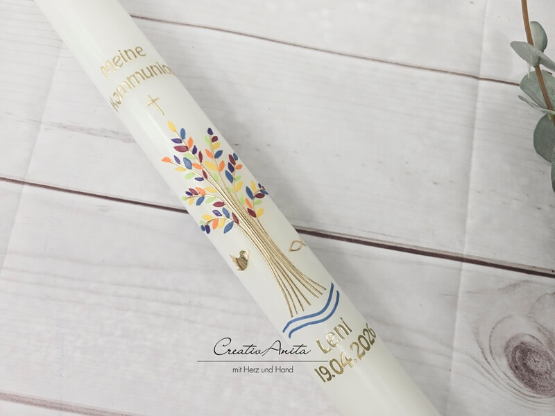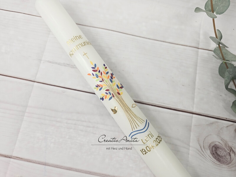Kommunionkerze Baum bunt-gold oder in Wunschfarbe Kreuz, Wasser, Taube, Fisch