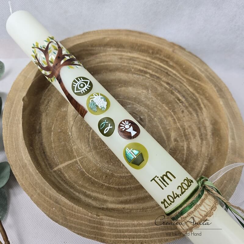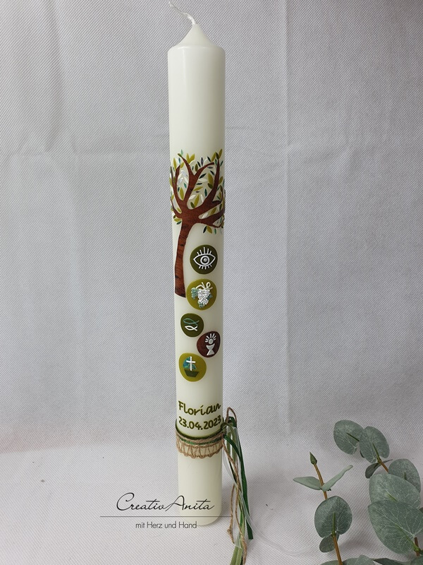 Kommunionkerze Baum in Olive-Braun mit christlichen Symbolen