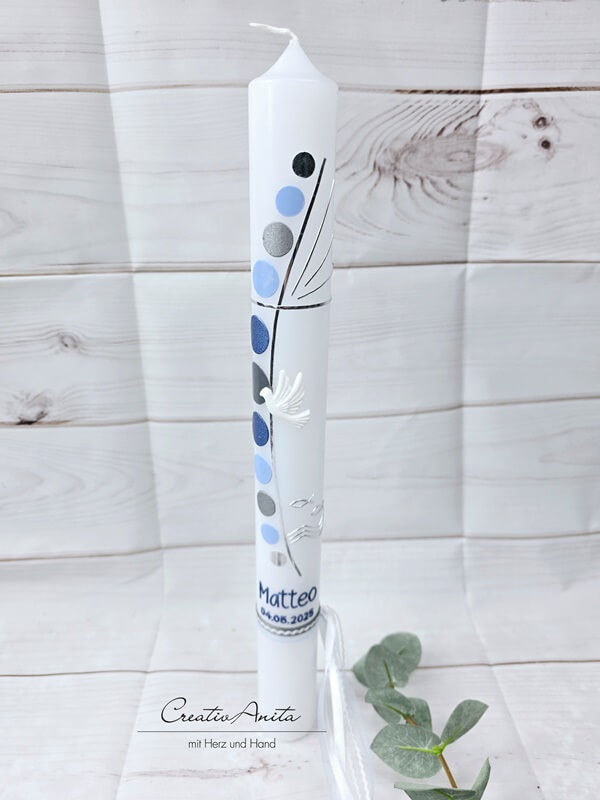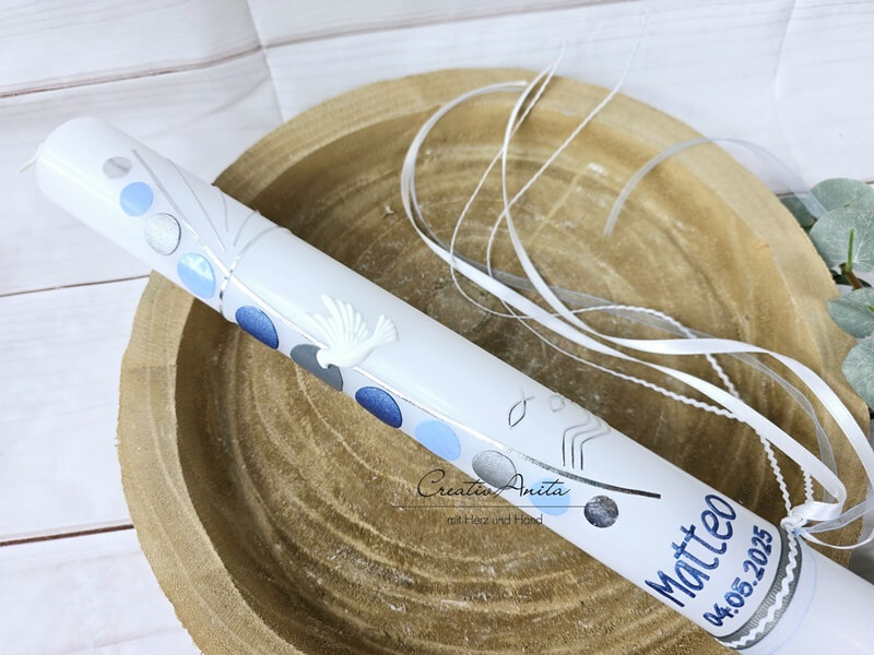 Kommunionkerze Kreise in Blau-Silber mit christlichen Symbolen