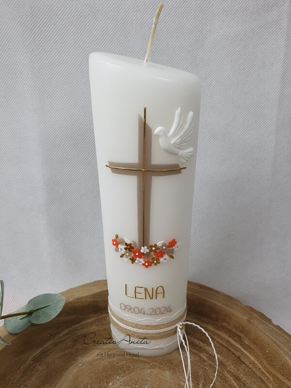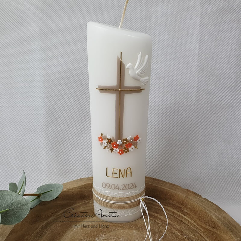 Kommunionkerze Kreuz - Taupe-Apricot-Gold mit Taube Ellipse schmal - Mädchen - personalisiert