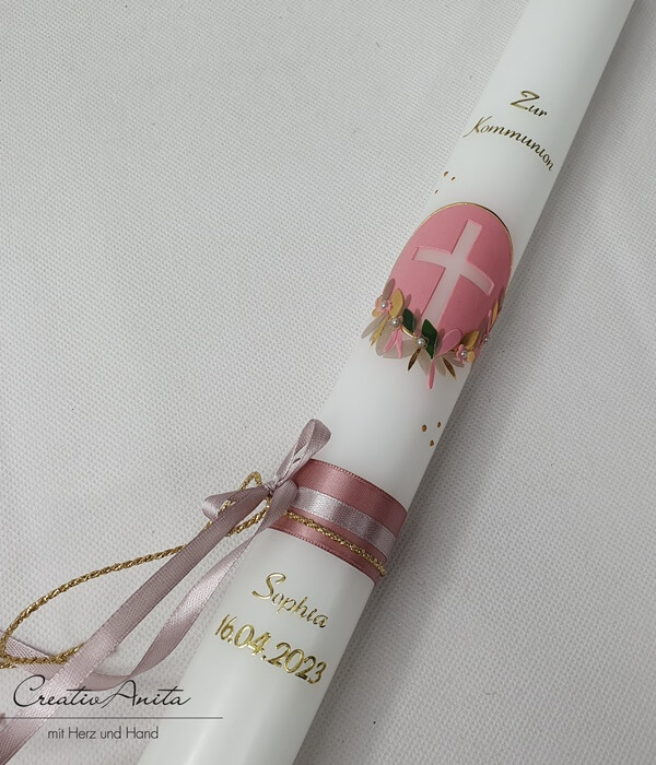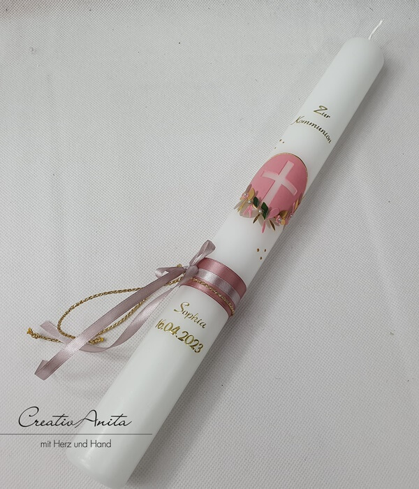 Kommunionkerze mit Kreuz und Blätter in Altrosa-Gold