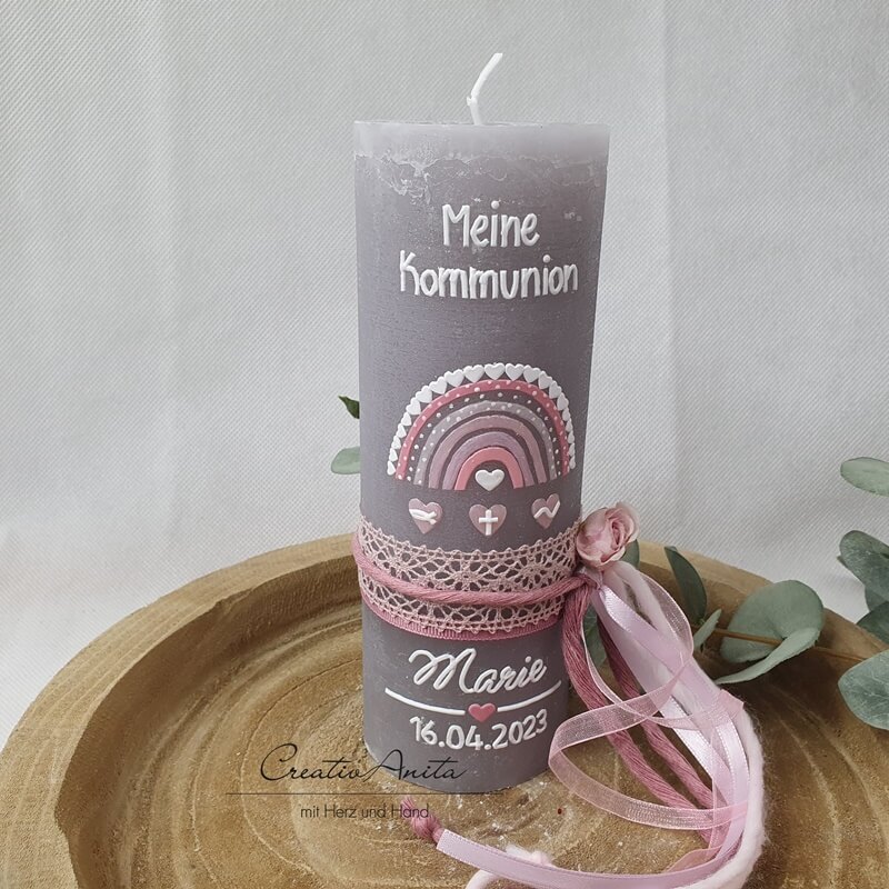 Kommunionkerze Rustikkerze mit Regenbogen und Herzen -altrosa- verziert