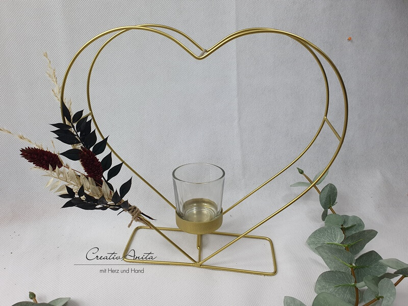 Krasilnikoff - Kerzenhalter Herzform Gold dekoriert mit Trockenblumen
