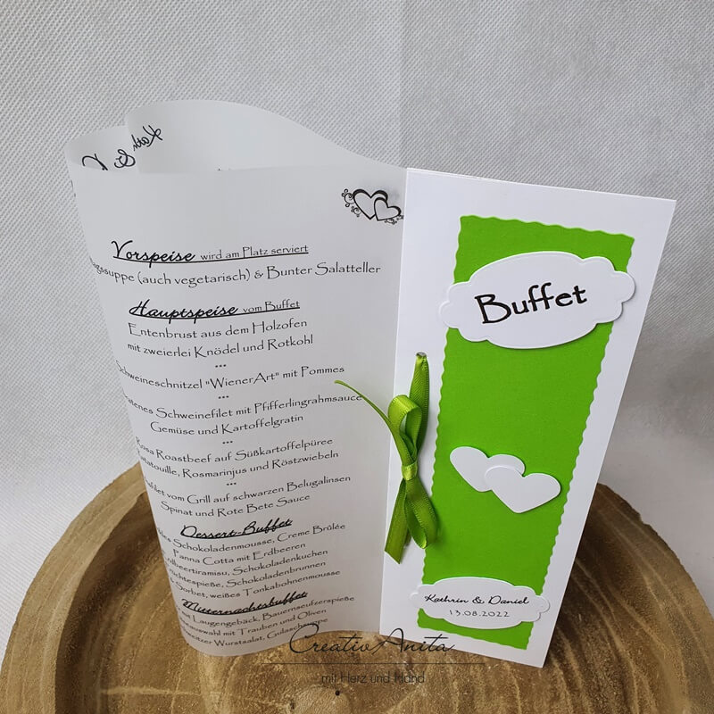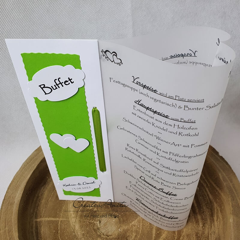 Diese Menükarte wird in Ihrer Wunschfarbe mit Herzen angefertigt. Desweiteren wird die Vorderseite mit zwei Auflegern, personalisiert nach Ihrem Wunsch, bestückt.