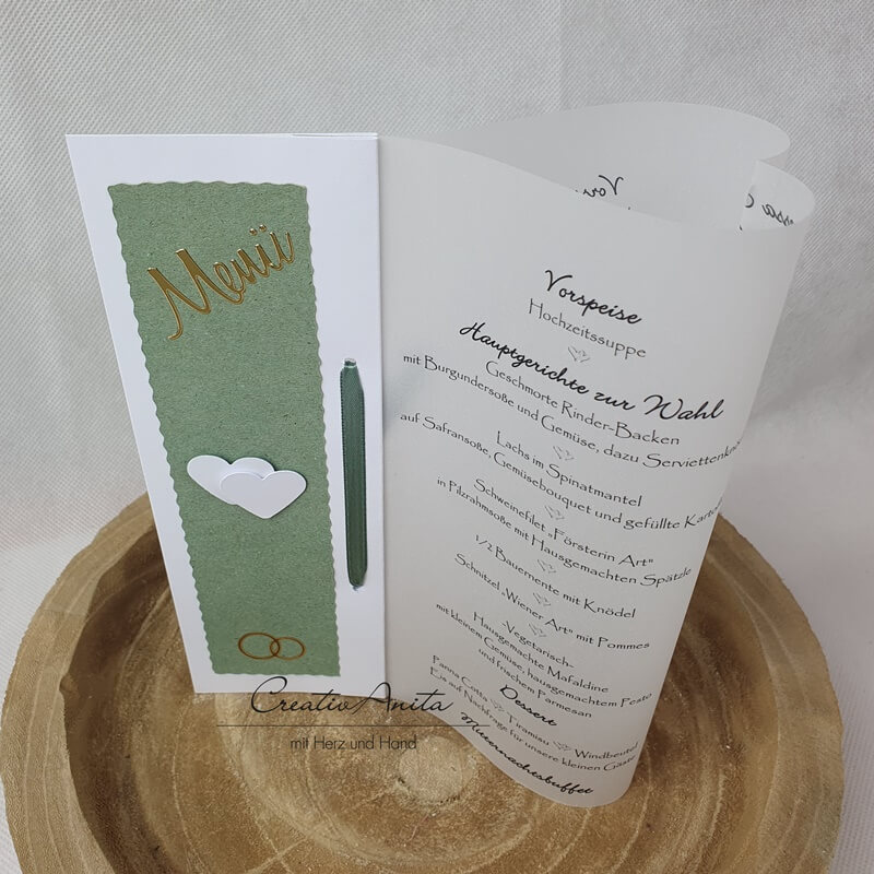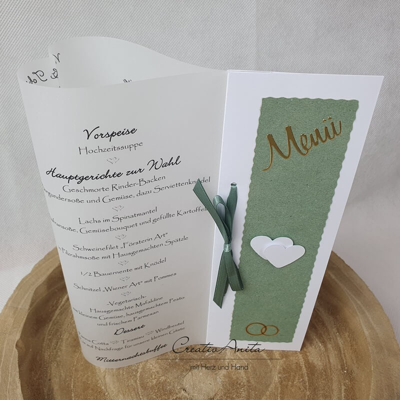 Menükarte in HERZFORM! Traumlicht in Weiß-Salbei-Gold