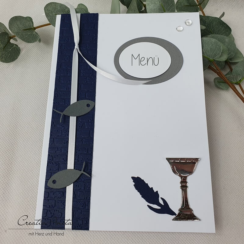 Handgearbeitete Menükarte "Christlich" in Dunkelblau-Weiß