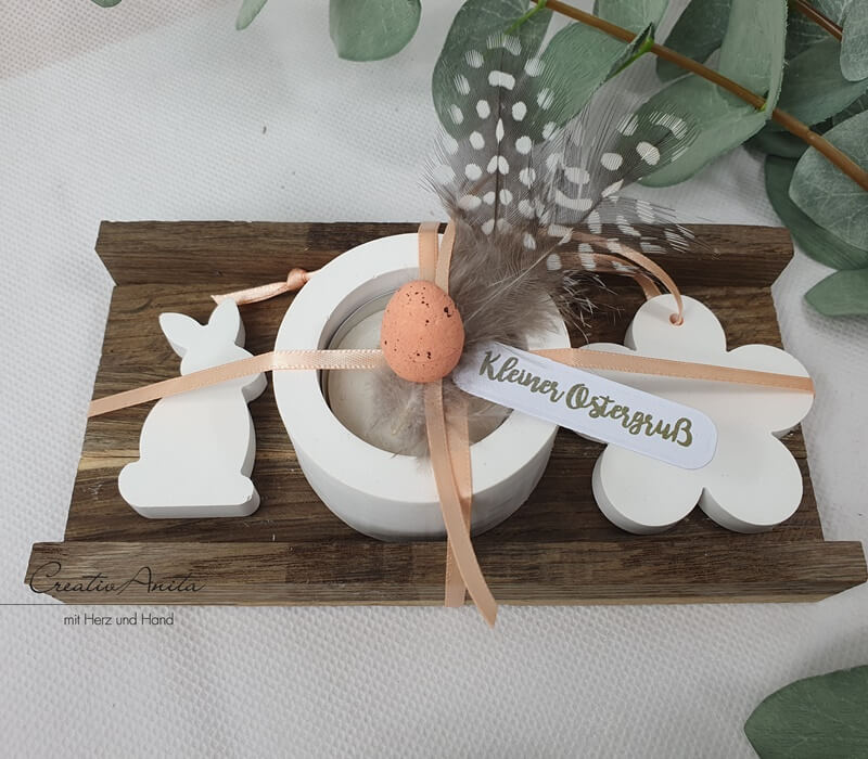 Die handgemachte Holzverpackung wurde befüllt mit einem Teelichthalter, einem Osterhasen und einer süßen Blume als Anhänger. Der Osterhase kann aufgestellt werden. Der Fantasie sind keine Grenzen gesetzt.