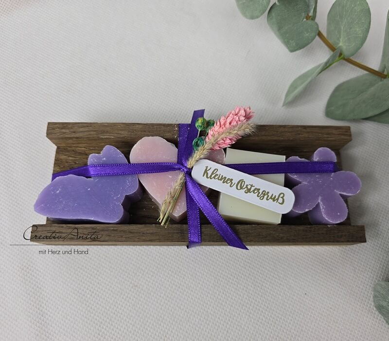 Ostergeschenk Schafmilchseifen in Holzverpackung Ostergruß Hase-Schmetterling lila-weiß