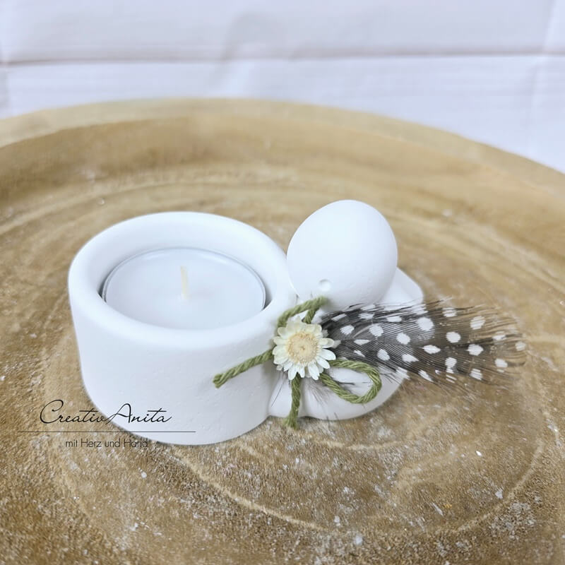 Ostergeschenk Teelichthalter -Osterhase- dekoriert mit Feder und Blümchen