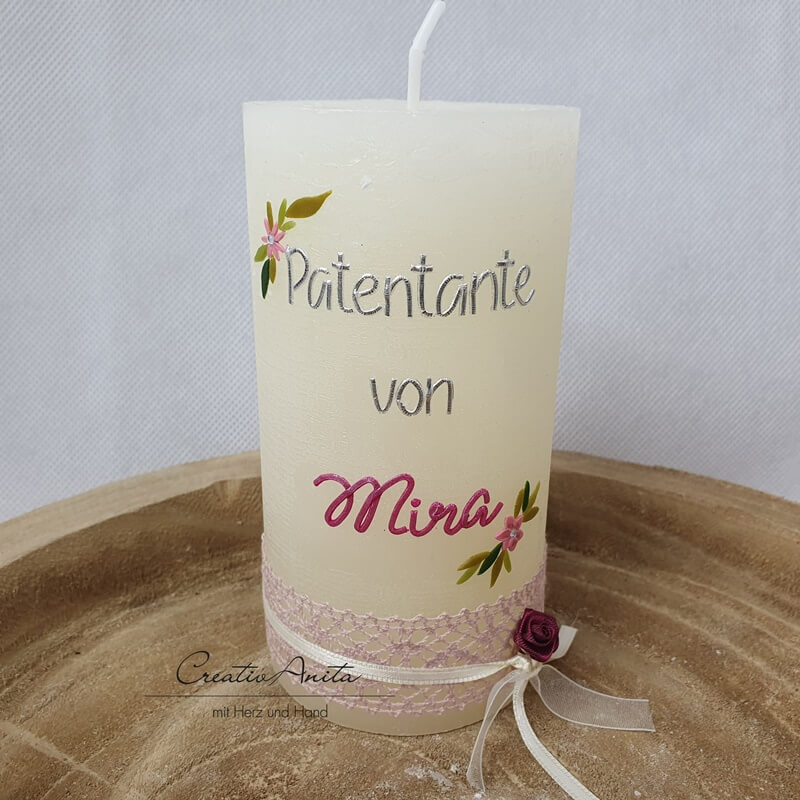 Handverzierte Kerze mit der Aufschrift Patentante / Patenonkel von Täufling ... . Verziert mit kleinen Blätter, Blüten und Schleifenbänder.