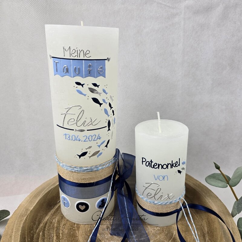 Patenkerze passend zur Taufkerze -Fische in Blau-Silber