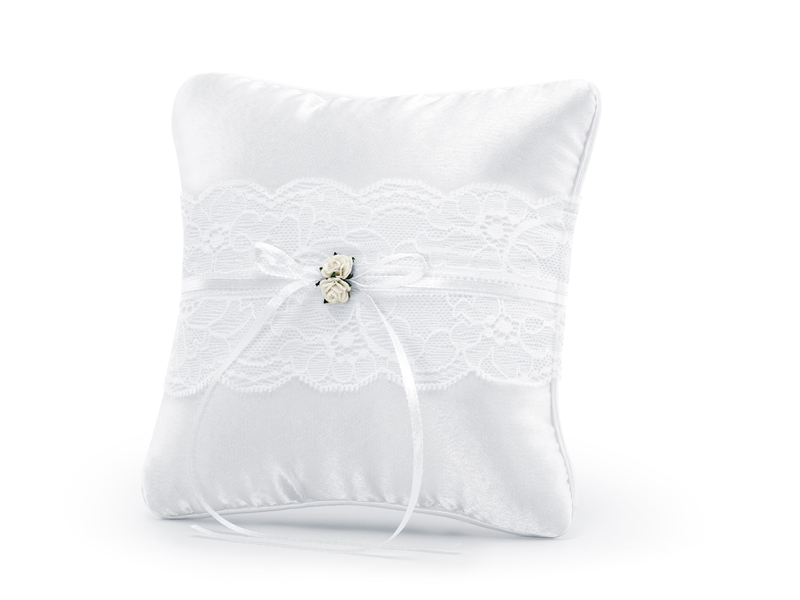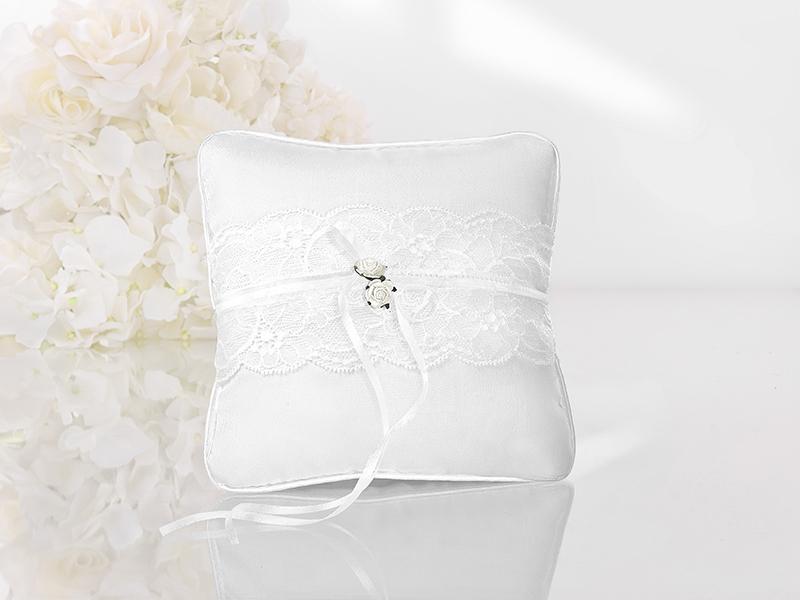 Tolles Ringkissen in mattem Weiß, dekoriert mit Spitzenband und weißen Röschen.