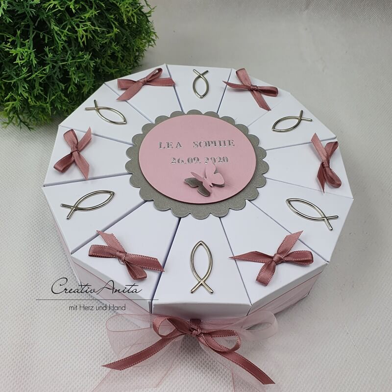Wundervolles Geschenk zur Kommunion - Konfirmation - Firmung in Form einer Torte - Schachteltorte mit Fischen.