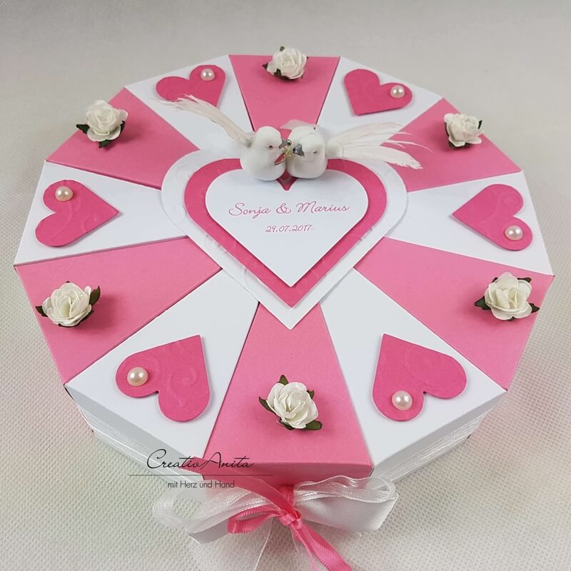 Schachteltorte mit Herzen & Röschen - Geldgeschenk Hochzeit DUNKELROSA-WEISS