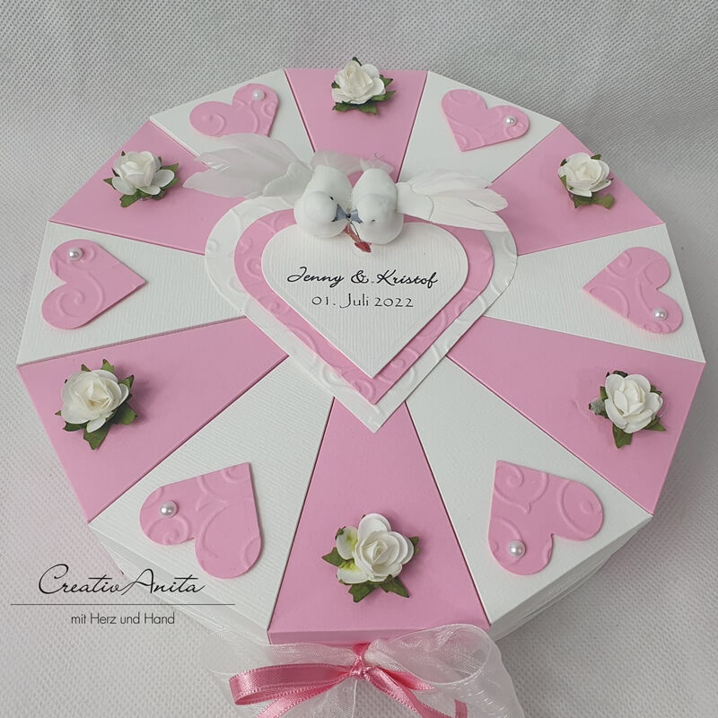 Schachteltorte mit Herzen & Röschen - Geldgeschenk Hochzeit ROSA-ALTWEISS
