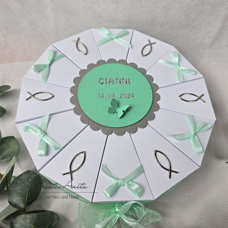 Schachteltorte mit Fischen zur Kommunion - Geschenk in Weiß-Mint