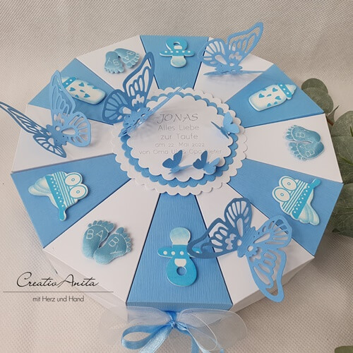 Wundervolles Geburts- oder Taufgeschenk in Form einer Torte - Schachteltorte zur Geburt oder Taufe.