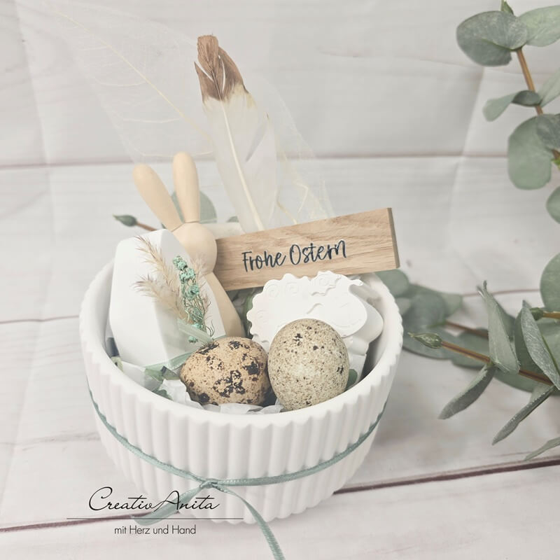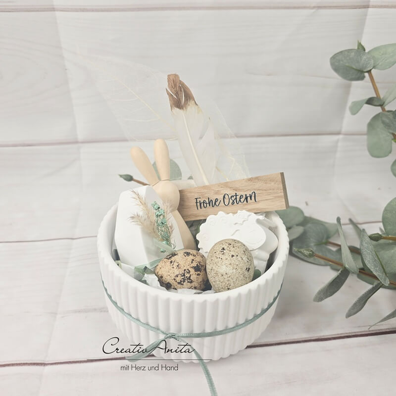 Schale befüllt mit Holzhase und Betonhaus - liebevoll dekoriert