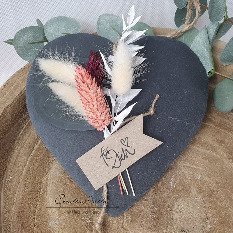 Schieferherz mit Trockenblumen und Anhänger -Für Dich- dekoriert