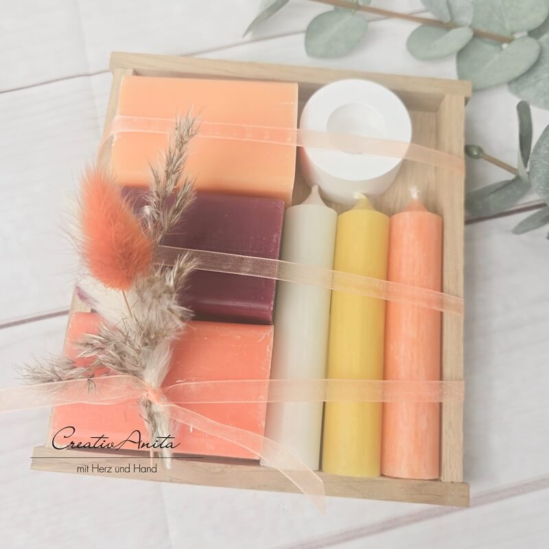 Zusätzlich sind noch drei Kerzen und ein handgegossener Kerzenhalter aus Beton in dem Holztablett enthalten.