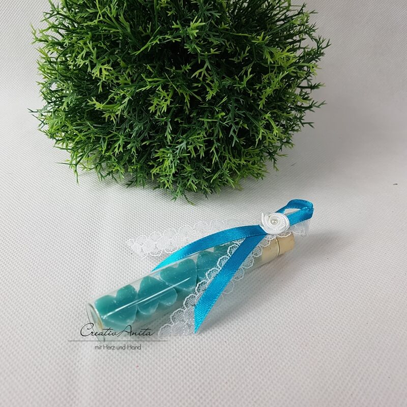 1 Stück entzückendes Gastgeschenk - Reagenzglas befüllt mit je 5 Schafmilchseifen-Herzen minimini in der Duftnote KORNBLUME - TÜRKIS,
