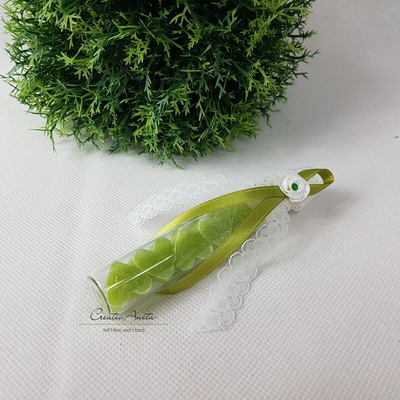 1 Stück entzückendes Gastgeschenk - Reagenzglas befüllt mit je 5 Schafmilchseifen-Herzen minimini in der Duftnote LEMONGRAS - GRÜN,