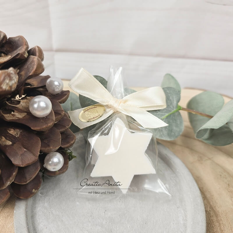 Seifenstern Schneerose dekoriert und verpackt -WEIß-CREME-