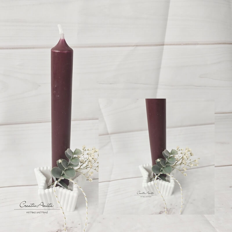 Stabkerzenhalter in Sternform mit Rillenoptik - Eukalypthus und Schleierkraut dekoriert -bordeaux-